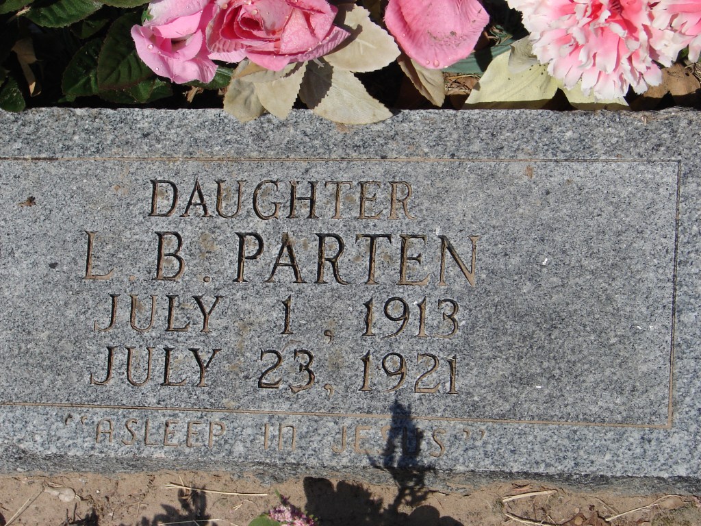 Lizzie Beth Parten was born on 1 July 1913 near Delia in Limestone County, Texas. She was the daughter of James Monroe Parten and Winnie Johnson Parten. Lizzie Beth was affectionately called L.B. by her family. She was the baby of the family before my grandmother was born in 1921. That was the year tragedy struck.