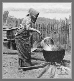 Before the luxury of indoor washing machines, women used large outdoor cast iron kettles to do their laundry. They would fill the pot with water, then build a fire underneath it. Once the water was heated, they would either pour soap powder into the water or use lye soap. They would then drop their clothes into the scalding water and stir the clothes around with a stick, similar to the modern day washing machine’s agitator.