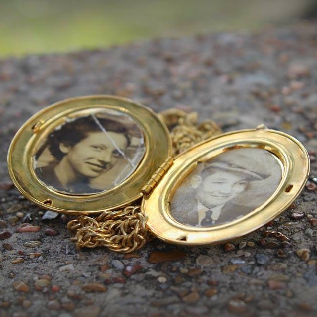 This was my grandmother’s locket she had in her jewelry box. Several years after she passed away, my Aunt Carolyn brought the jewelry box to a family get-together because she wanted all of us to be able to choose a piece of my grandmother’s jewelry. My daughter pulled out the locket and opened it. We were all stunned to see the photographs inside. No one had ever opened the locket before that point in time. It was a rare treasure. This was about the age my grandparents were when they met.