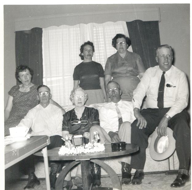 Parten Family; Standing L to R front row is Margaret Evelyn Parten (my grandmother), James Monroe Parten, Winnie Johnson Parten, Audrey Alice Parten, Lloyd Monroe Parten, Velva Maxine Parten. Back row L to R is Guy Parten and James Dellis Parten. Clara Parten is not pictured as she passed away before the photo was taken. She died during childbirth along with her stillborn child. James Monroe Parten passed away in 1933, not long after this picture was taken.