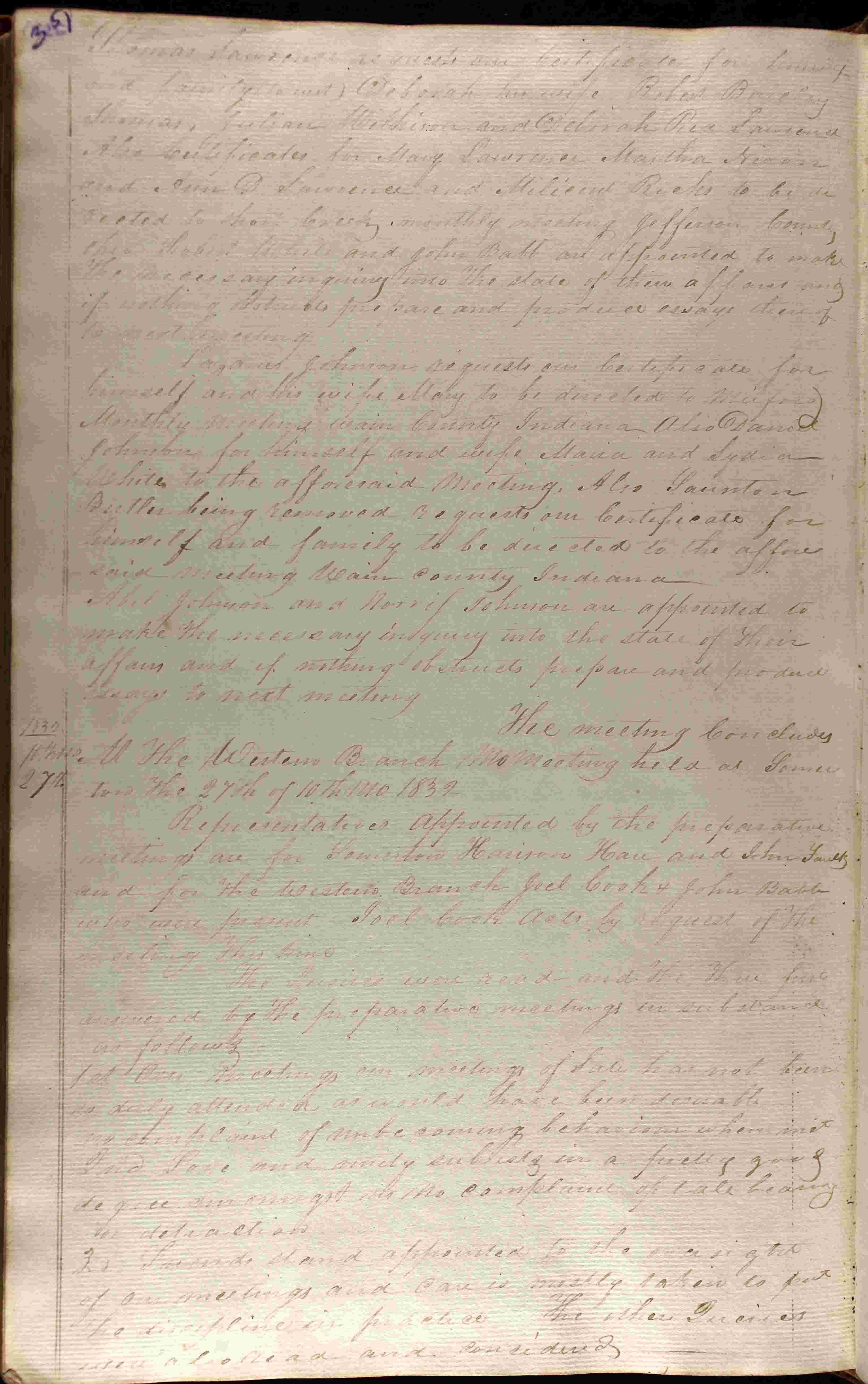 To Milford Meeting, Wayne County Indiana, Dear Friends Lazarus having removed to reside wherein your ___ requests our certificate for himself and wife Mary. These are to certify that they are members with us and that his affairs appear to be settled to satisfaction as such we recommend them to your Christian care and ___ given forth by the W Branch Monthly Meeting of Friends held alternately at Somerton in Nansemond County the 22nd of 12th month 1832”[6]