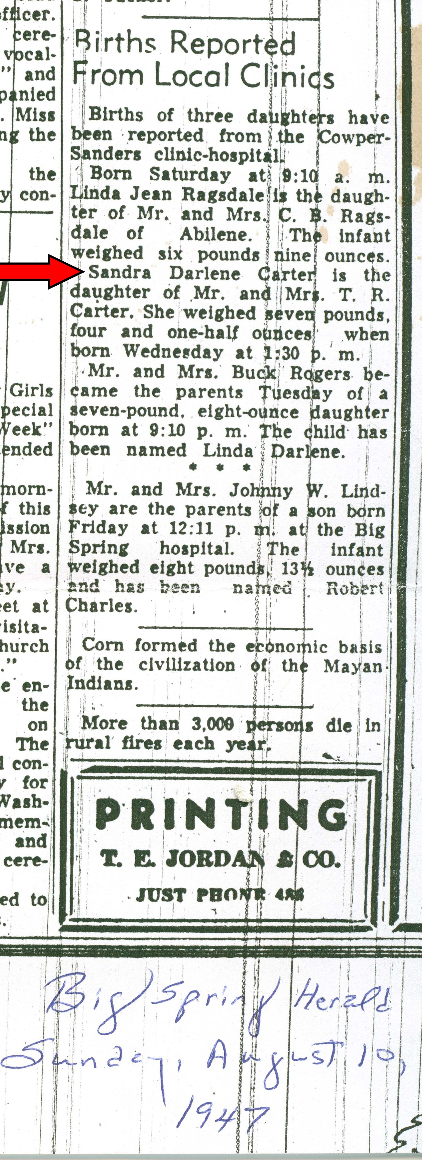 “Dear Teresa, I wish I could tell you more about your mother’s father, but I know very very little. His name was Robert Carter, he lived in Waco. I only saw him once, don’t remember what he looked like. He had been married, told Reta that he had his divorce but she found out later that he didn’t, so she left and went to Big Springs Tx where her best girl friend lived. He came out there and got thrown in jail. I don’t know what happened. Anyway, (Grannie), my mother and dad went out there and stayed until Sandra was born, then brought them back to Waco with them. Reta never wanted to talk about him so I respected her privacy. She met and married Jannice’s dad when Sandra was still so small that we just never thought of him as her dad since Johnny adopted her. You can write the courthouse at Big Spring, Tx and ask for a copy of the birth certificate. Give date of birth and the mother’s name, try Carter if there is none, try Roundtree. I don’t know. I’m sorry I can’t help you more but that’s all I know about him.  I called and talked to Reta’s friend, the one that lived in Big Springs but she couldn’t help much, she said he was tall, dark headed with blue eyes like Sandy, said Sandy looked a lot like him. She hadn’t seen or heard of him in years. She didn’t know if he was even still alive. I have some pictures of Grannie and Grandpa Roundtree, I’ll get some copies made for you. Take care, I love you. Aunt Aline”