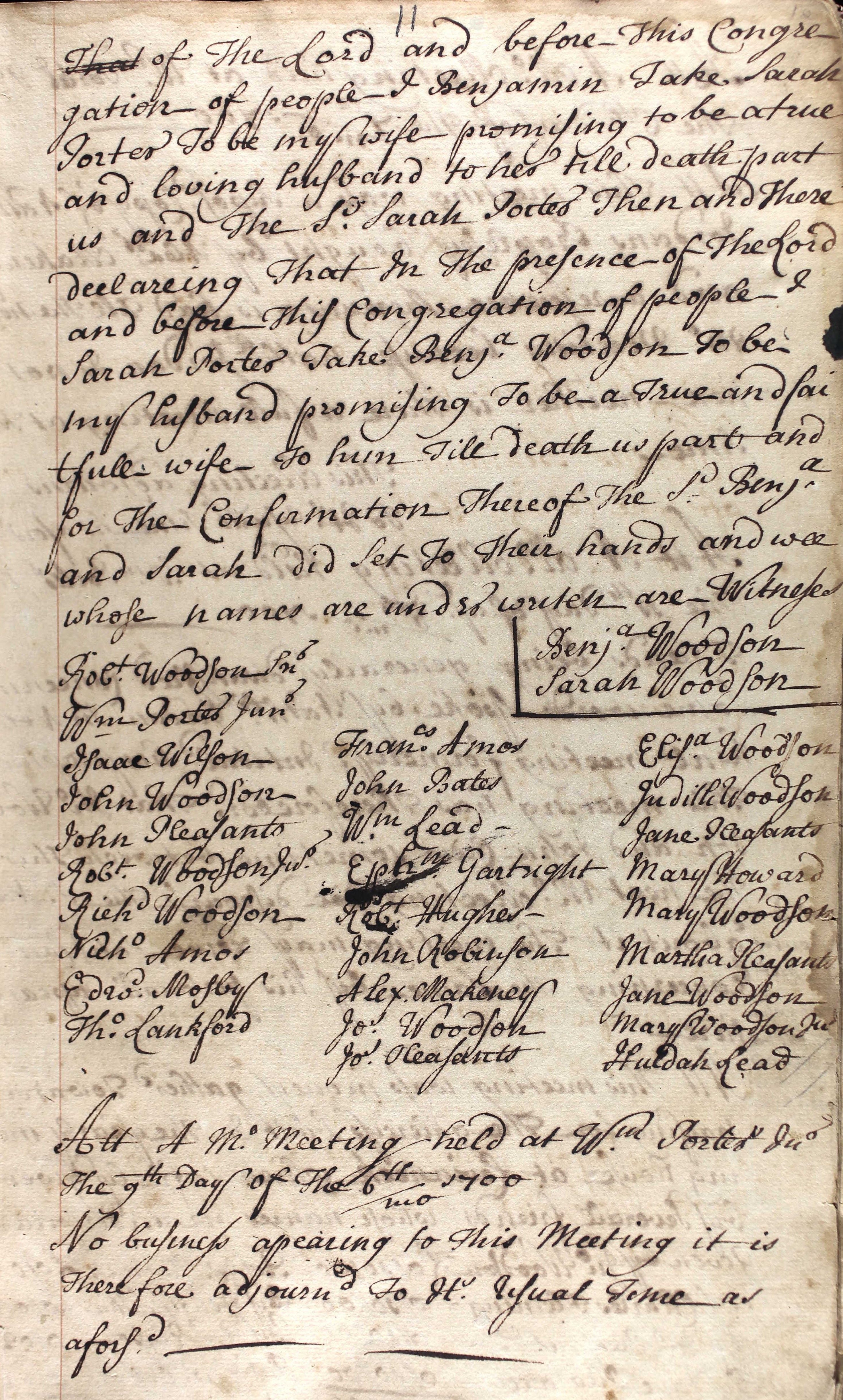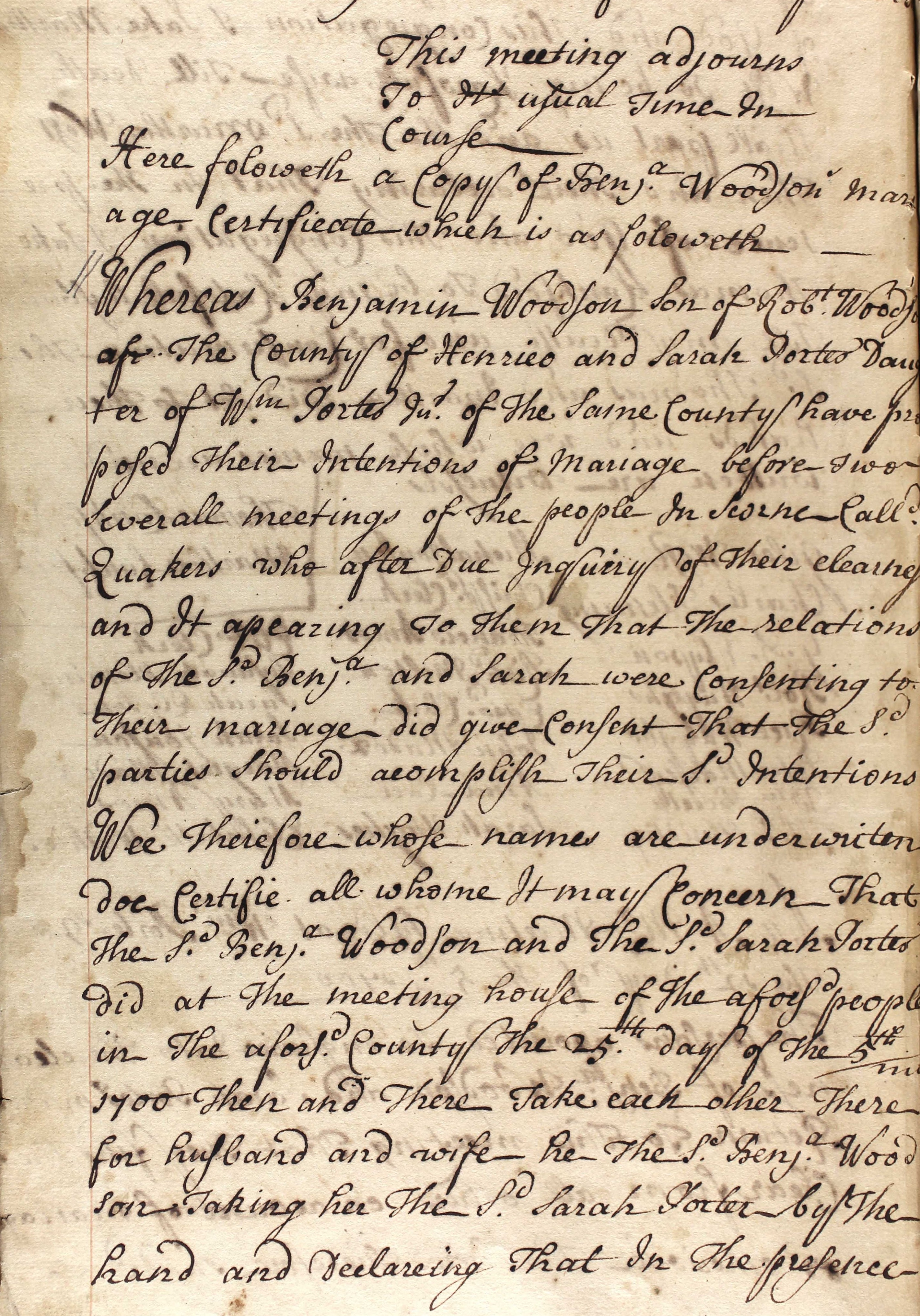 “ Here foloweth a copy of Benj. Woodson marriage certificate which is as foloweth— Whereas Benjamin Woodson son of Rob’t Woodson of the county of Henrico and Sarah Porter daughter of Wm. Porter in of the same county have proposed their intentions of marriage before sworn several meetings of the people in sworn called Quakers who after due inquiry of their clearing and it apeazing to them that the relations of the sd. Benj. and Sarah were consenting to their marriage did give consent that the sd. parties should accomplish their sd. intentions. Wee therefore whose name are underwriten doe certifie all whome it may concern—That the sd. Benj. Woodson and the sd. Sarah Porter did at the meeting house of the afor’d people in the afors’d county the 25th day of the 5th mo. 1700 then and there take each other therefor husband and wife – he the sd. Benj. Woodson taking her the sd. Sarah Porter by the hand and declaring that In the presence of the Lord and before this congregation of people—I Benjamin take Sarah Porter to be my wife – promising to be a true and loving busband to her till death part us  and the sd. Sarah Porter then and there declaring that In the presence of the Lord and before this congregation of people – I Sarah porter take Benj. Woodson to be my husband promising to be a true and faithful wife to him till death us part and for the confirmation thereof the Sd. Benj. and Sarah did let go their hands and – whose names are and so written are witnesses